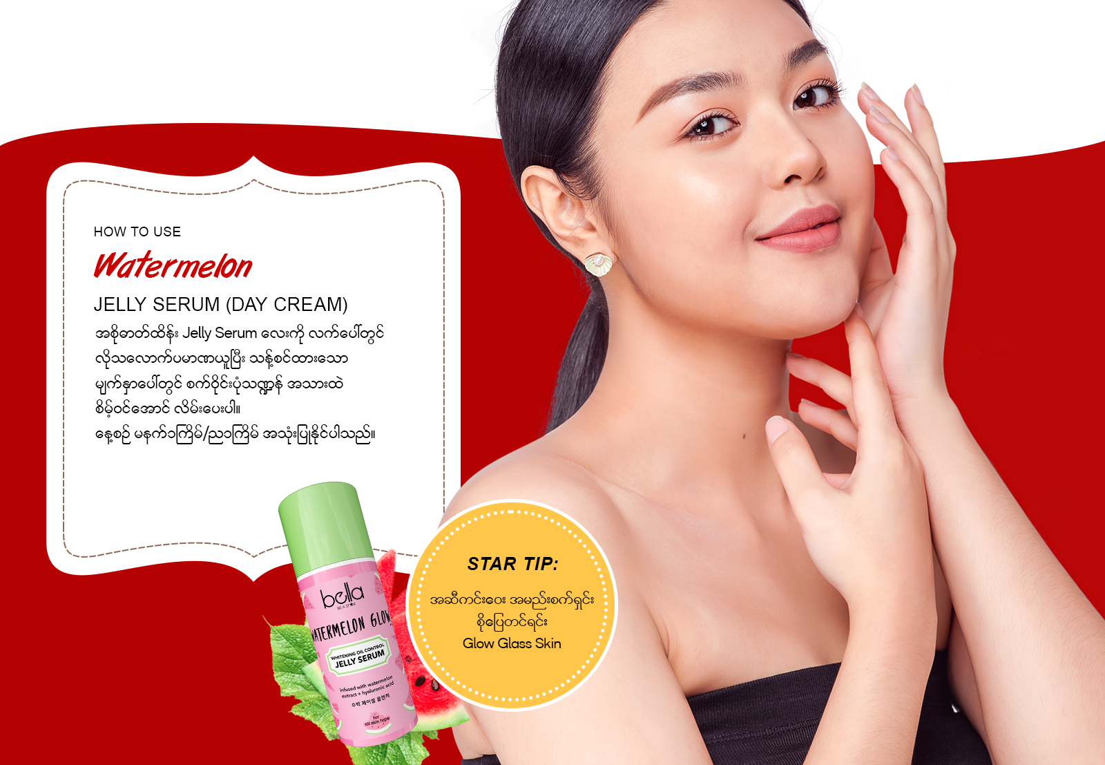"အဆီမပါတဲ့ Watermelon Jelly Moisturizing Serum လေးဟာ သဘာ၀ဖရဲသီး အနှစ်၊ hyaluronic Acid နှင့် Vitamin များကြွယ်၀စွာ ပါ၀◌င်သောကြောင့် အမဲစက်ကင်း ရေဓါတ်ဖြည့်ပေးပြီး စိုပြေတင်းရင်းစေလို့ Glowy Glass Skin ကို ပိုင်ဆိုင်စေမှာပါနော်