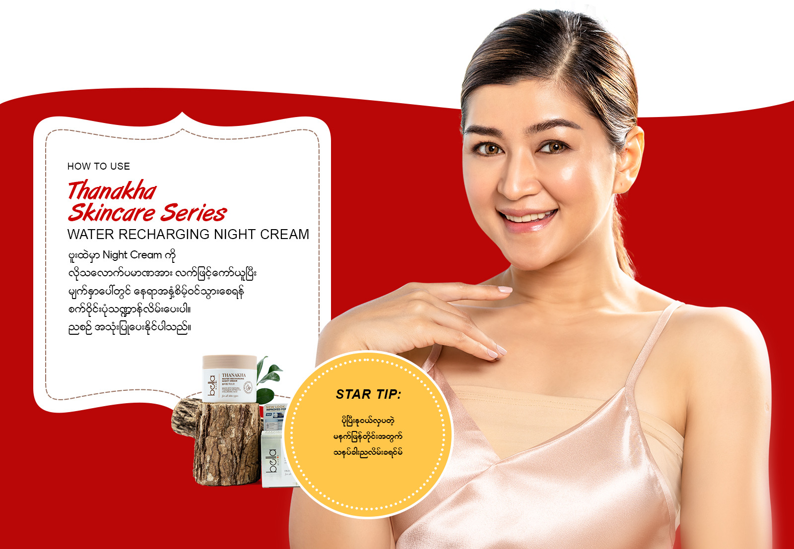 Thanakha Recharging Night Cream မှ တစ်နေကုန်ပင်ပန်းလို့ ကုန်ဆုံးသွားတဲ့ ရေဓာတ်တွေကို ညအိပ်နေတဲ့ အချိန်မှာ ပြန်ဖြည့်ပေးမှာမို့ မွဲခြောက်နွမ်းနယ်ပြီး မညီညာတဲ့ အသားအရေတွေကို နှုတ်ဆက်လိုက်တော့နော်။ Water Recharging Night Cream က Gel Type ဖြစ်လို့ လုံးဝစေးကပ်ခြင်းမရှိပဲ မြန်မာ့သနပ်ခါးနှင့် Korea ရဲ့ နည်းပညာပေါင်းစပ်ထားမှုကြောင့် အမြင့်ဆုံးရေဓါတ်တွေကို ညအိပ်နေတဲ့အချိန်မှ ပြန်လည်ဖြည့်ဆည်းပေးနိုင်ပါတယ်။ နှစ်ခြိုက်စွာ အိပ်စက်စေပြီး အရေးအကြောင်းတွေကို သက်သာလျော့နည်းစေတဲ့အပြင် အိုမင်းရင့်ရော်ခြင်းကို ကာကွယ်ပေးပါတယ်။ Hyaluronic Acid ပါဝင်သောကြောင့် လိမ်းလိုက်တာနဲ့ အေးမြစေပြီး မွဲခြောက်နွမ်းနယ် မညီညာတဲ့ အသားအရေကို အသားအတွင်းထဲအထိ ပြန်လည်ကြည်လင်ဖြူဝင်းစေပါတယ်။