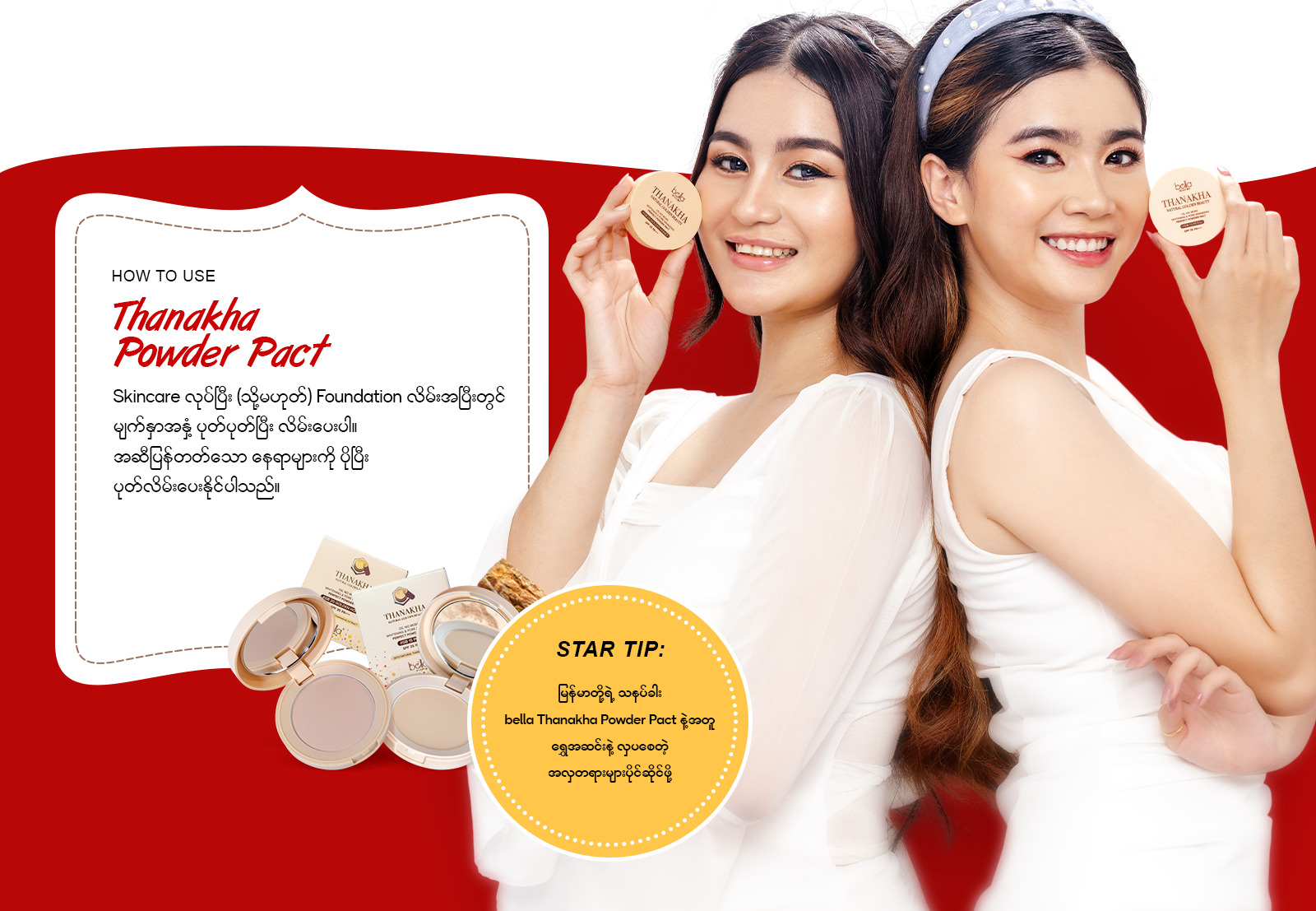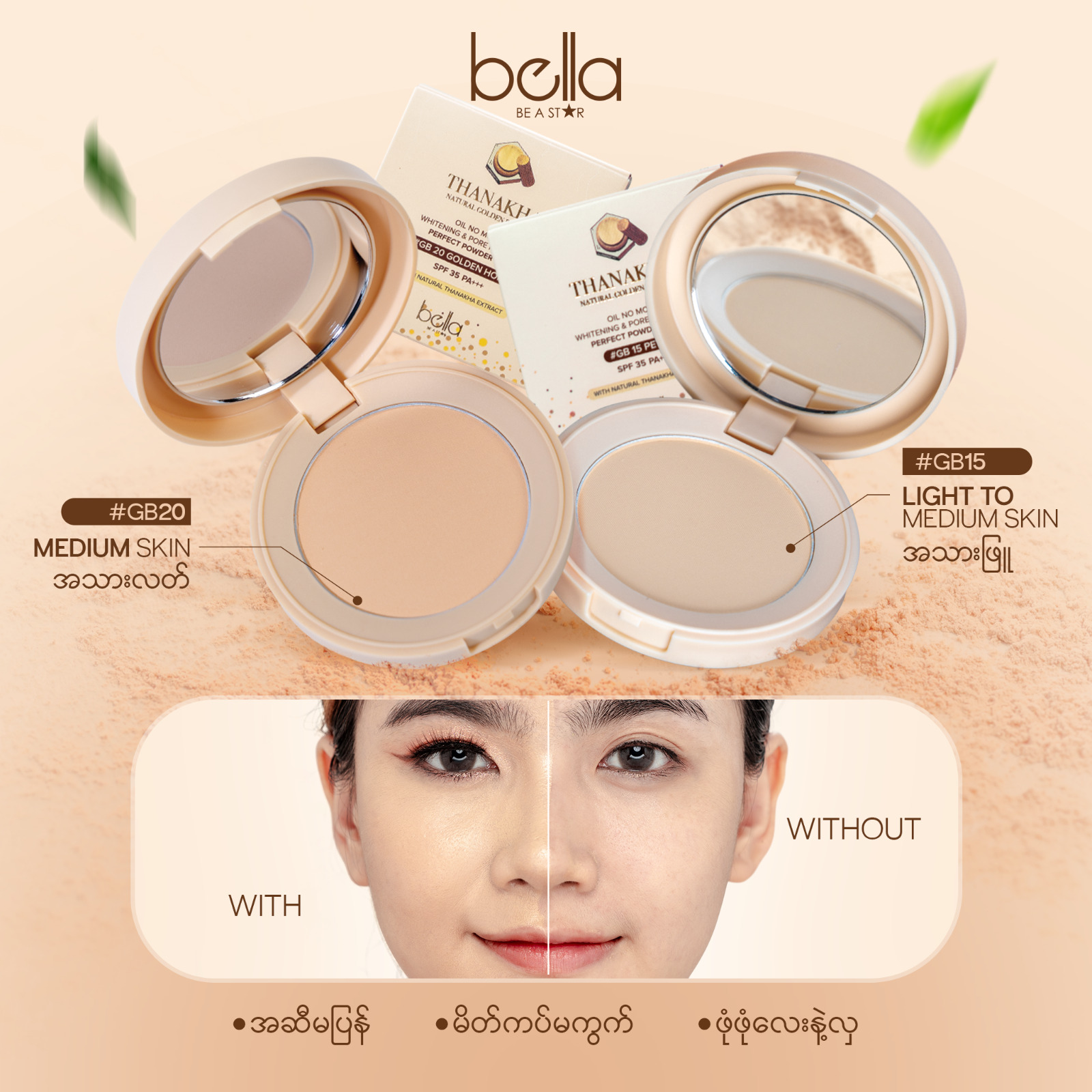 ပူပြင်းစိုစွတ်တဲ့ ရာသီဥတုမှာနေတဲ့ မြန်မာလူမျိုးများရဲ့ နေ့တိုင်းကြုံတွေ့ရတာကတော့ အဆီပြန်တာကြောင့် မိတ်ကပ်လိမ်းပြီး သိပ်မကြာခင်မှာပဲ မိတ်ကပ်သား မတင်ခြင်းဖြစ်ပါတယ်။ ဒါကြောင့်လည်း မြန်မာလူမျိုးများက အဆီပြန်ခြင်းကို ထိန်းသိမ်းပေးပြီးအေးမြတဲ့ ခံစားမှုကို ပေးစွမ်းနိုင်တဲ့ သနပ်ခါးကို ကြိုက်နှစ်သက်ကြတာပေါ့။ bella ရဲ့ Oil No More Whitening & Pore Minimizing သနပ်ခါး Powder Pact က အရေပြားမှ အဆီထွက်မှုကို လျှော့ချပေးပြီး အဆီပြန်ခြင်းကို ၁၂ နာရီကြာ ထိန်းသိမ်းပေးပါတယ်။ သနပ်ခါးရဲ့ အေးမြမှုကို ခံစားရတဲ့အပြင် ပိုးသားလေးလို ချောမွေ့တဲ့ အထိအတွေ့နဲ့ ချွေးပေါက်တွေကိုလည်း ကျဥ◌်းစေပြီး အမဲစက် အမာရွတ်နဲ့ အရေးအကြောင်းများကို အပြည့်အဝဖုံးပေးတာကြောင့် ဘယ်နေရာက ကြည့်ကြည့် အသားအရေက ချောမွတ်လှပနေတာပေါ့။ ကိုရီးယားမှ သဘာဝ Minerals များနှင့် Vitamin C ပါဝင်လို့ အသားအရောင်ကို ညီညာဖြူဝင်းစေပါတယ်။ SPF 35 PA+++ ပါဝင်တာကြောင့် နေလောင်ဒဏ်ကိုလည်း ကာကွယ်ပေးတယ်နော်။