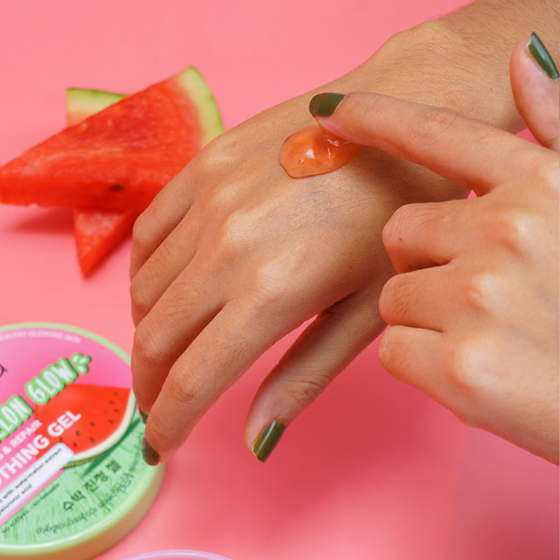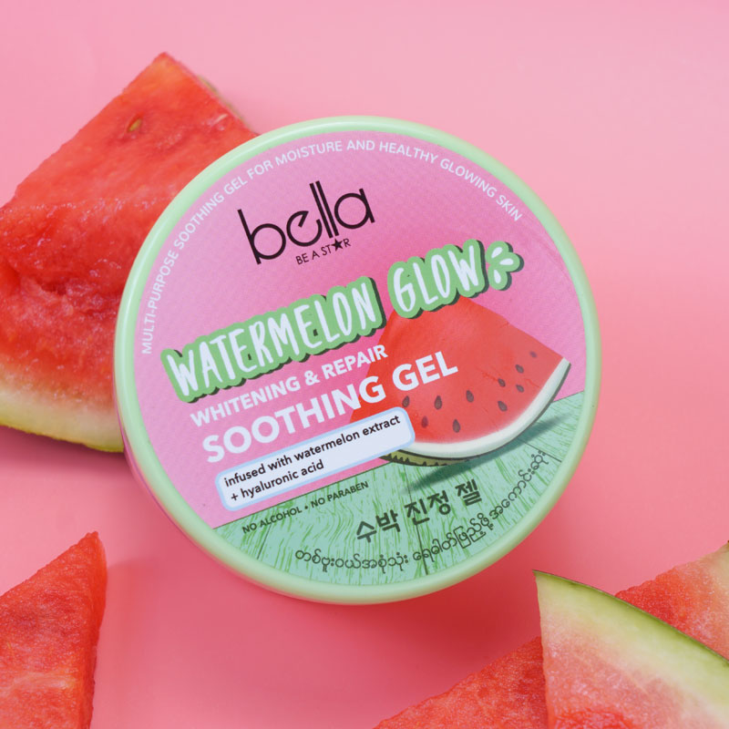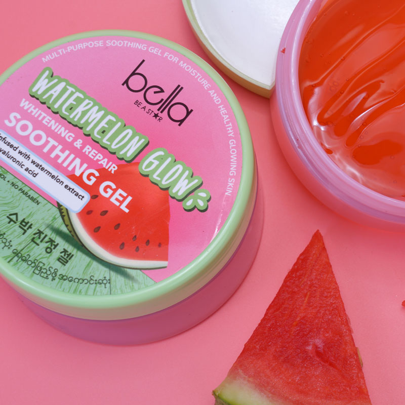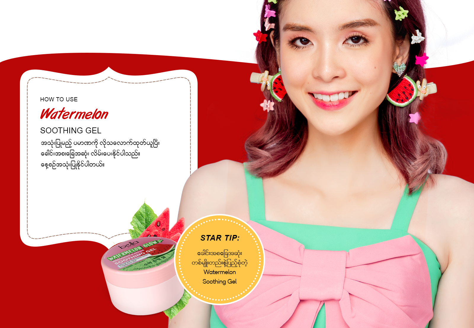 သဘာ၀ဖရဲသီးမှ ရရှိသည့် အာနိသင် (၉၀%)နှင့် ထုတ်လုပ်ထားသဖြင့် ရေဓါတ်ကို အပြည့်အ၀ဖြည့်ပေးနိုင်လို့ မိမိခန္ဓာကိုယ်ရှိ အပူများကို လျော့နည်းစေပြီး အသားအရေကိုနူးညံ့စိုပြေစေကာ ကြည်လင်၀င်းပလာစေပါသည်။စေးကပ်မှုမရှိပဲ အသားထဲသို့ အလွယ်တစ်ကူစိမ့်၀င်နိုင်ပြီး လတ်ဆတ်တဲ့ဖရဲသီးရနံ့လေးကြောင့် လိမ်းထားရင် တနေ့လုံးစိတ်ကြည်လင်လန်းဆန်းစေပါသည်။Vitamin C ပါ၀င်လို့ အသားအရေကို အရေးအကြောင်းကင်းကာ နုပျိုစေသည်။နေလောင်ဒဏ် ၊ အပူဒဏ်၊ အသားအရေယားယံခြင်း၊ မိတ်ဖုများထွက်ခြင်းကိုလဲသက်သာစေသည်။ တစ်ဗူးတည်းရှိရုံနဲ့ hand gel,body lotion,hair gel,moisturizer တို့ အဖြစ်ခေါင်းအစခြေအဆုံးသုံးပေးနိုင်ပါသည်။ နေလောင်ပြီး အသားအရေတွေကိုလဲ watermelon soothing gel သုံးပေးခြင်းဖြင့် ပြန်လည်ကောင်းမွန်လာစေပြီးနေရောင်ထဲမထွက်ခင်လိမ်းပါက တင်းတိပ်၊ အမဲစက် ဖြစ်ပေါ် ခြင်းများကို သက်သာစေပါသည်။