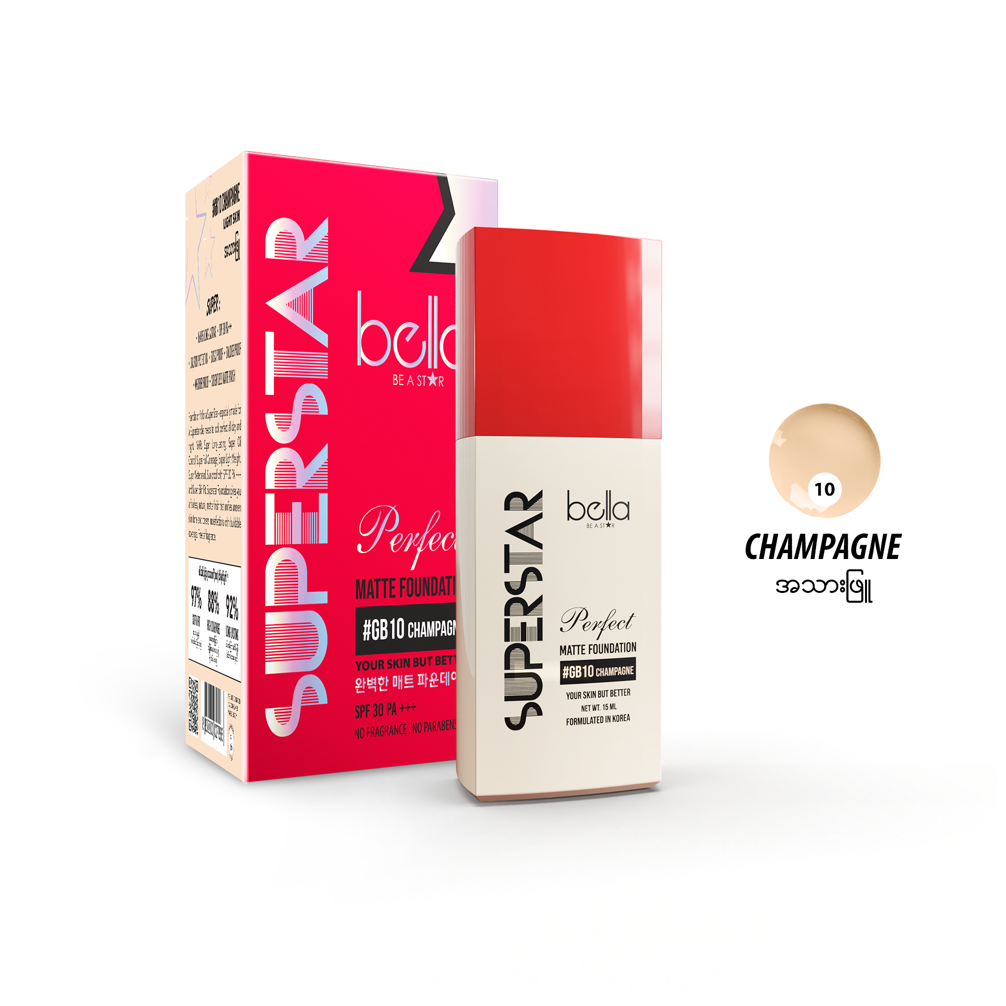 Superstar လို လှစေတဲ့ supetstar foundation ဟာ super long lasting 16 နာရီမိတ်ကပ်သား ကြာရှည်ခံစေတယ် .. Super Oil Control အဆီပြန်ခြင်းကို Super ထိန်းချုပ်နိုင်တယ် .. Super Coverage အရေးအကြောင်းအပြစ်အနာအဆာတွေကို Super ဖုံးအုပ်ပေးနိုင်တယ် .. Super Weightless လိမ်းထားမှန်းမသိတဲ့ Super ပေါ့ပါးမှု .. Super Weather Proof , Sweat Proof, Smudge Proof ရေစို ချွေးစိုခံ ရာသီမရွေးလှစေတယ် .. Super Sun Proof SPF 30 PA+++ ပါ၀င်လို့ နေလောင်ဒဏ်ကို Super ကာကွယ်ပေးတယ် .. Super skin fit မို့ အသားရောင်နဲ့ တစ်ထပ်တည်းကျစေတယ် .. Primer, Concealer, Sun Cream လိုပါ သုံးနိုင်တာကြောင့် တစ်မျိုးတည်းနဲ့ Superstar ဖြစ်နိုင်ပြီ